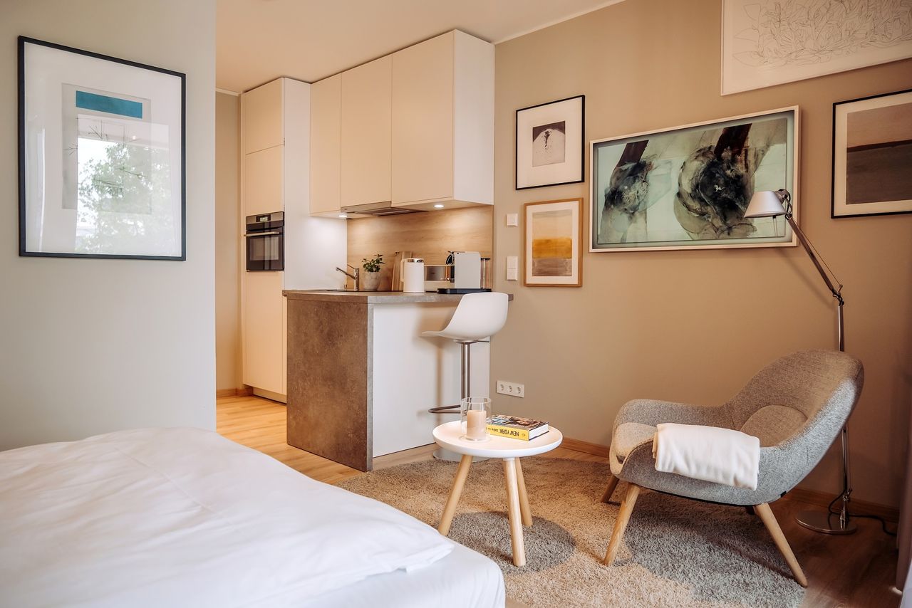The Urban Apartments with their compact floor plans are ideal for short and medium-term stays. - Private balcony - 140 cm queen-size bed - spacious bathroom - fully equipped Siematic kitchen with brand-name appliances and high-quality fixtures and fittings Take advantage of our extraordinary Community Spaces - Cosy lobby with fireplace and seating - Workspace with long table for meetings - Chill out area on the roof terrace incl. barbecue use - Free use of the workout area: Exercise and relax i...