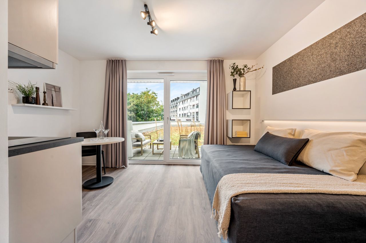 Moving into your new apartment in Connewitz has never been easier. The apartments in Leipzig are perfectly tailored to your lifestyle: a modern fitted kitchen with a fridge, stovetop, and microwave, along with a bed, desk, and wardrobe ensure that you feel right at home from day one. Some apartments even offer a private terrace or balcony – perfect for relaxing after a long day. A laundry room that's available around the clock makes everyday life even more convenient. With app control, you can ...
