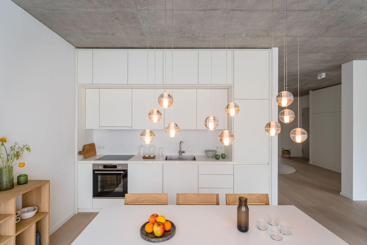 Space for retreat, and for togetherness: The 3-room apartment has both. To the left of the entrance hallway are two rooms, one large and one smaller. Both have floor-to-ceiling windows. Taking the hallway to the right and passing two bathrooms and a modern built-in closet, you enter the 36-square-meter living-dining area with an open kitchen. Through floor-to-ceiling windows across the width of the room, you look out onto the beautifully cut loggia with wooden floor and glass balustrade - for ex...
