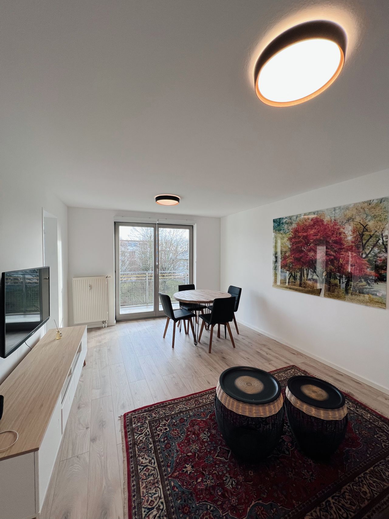We are offering a serene apartment for rent in Schönefeld, located near Berlin. The flat has undergone a complete renovation and is furnished with new furniture. A modern kitchen with all necessary cooking utensils and a new fridge are provided. Additional amenities include an ironing board and a washing machine is located in the laundry room of the apartment building. Fresh duvets, bed linen, and towels are available for up to four occupants. The cozy bedroom features a comfortable double bed, ...