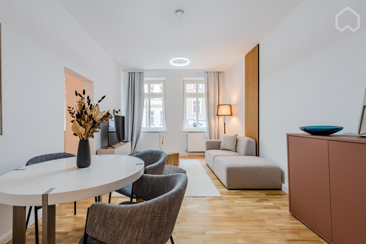 HOUSE The apartment is located on the raised ground floor of a typical Berlin renovated old building („Altbau“). APARTMENT This beautifully renovated and stylishly furnished apartment (Autumn 2025) offers everything you need for comfortable living. The bright living room features a cozy sofa that invites you to relax and a large smart TV to stream your favorite shows. A dining table seats four, perfect for meals or hosting friends. The fully equipped kitchen makes cooking easy, with a coffee ...