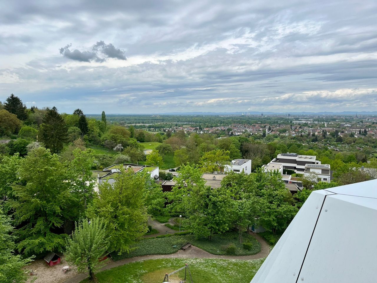 Are you looking for a temporary apartment with that certain something? Then come to the Geigersberg in Karlsruhe-Durlach. what you are offered Here you can make yourself comfortable in a modern, penthouse-like 2-room apartment. The highlight are the sunsets on the beautiful, spacious roof terrace with a view of the fan-shaped city of Karlsruhe and the Palatinate Mountains. In the adjacent forest area you can do sports or take relaxing walks. Position The apartment is on the 5th floor of a park-...