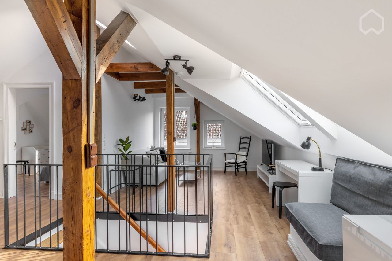 The renovated attic-apartment has an open living and dining area, a bedroom, a kitchen, a shower room, an entrance hall and a small study with a folding bed. The apartment is very bright thanks to the large skylight windows and offers a wide view of nature. The apartment is fully furnished and fully equipped, incl. 50"TV. In front of the entrance there is a private car-parking space with direct access to the private south-facing terrace with garden use. Position: The rental property is right on...