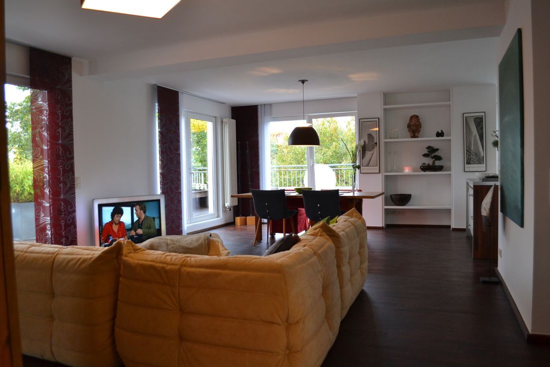 *English* Very quite Penthouse Appartement with loft character and surrounding 55 sqm terrace with view of the cathedral and the park. Located at the only inner city park within the Kölner Ringe Equipment Properties: large living-/dining area with a 8 person fitting wooden table and high quality chairs integrated fitted kitchen with kitchen block, double bed bedroom with large sliding doors separable and office, bath with walk-in shower (with Raindance shower), additional 55 sqm surrounding...