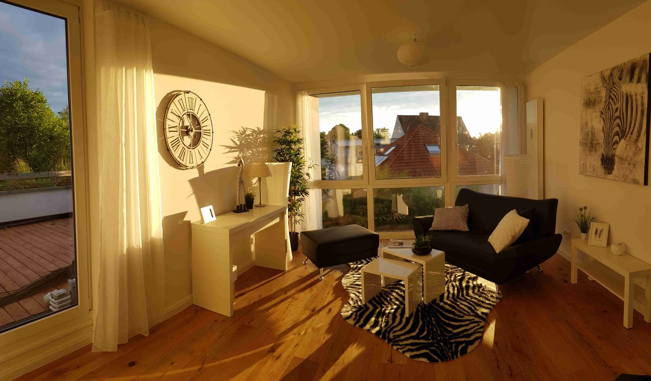 A large and bright maisonette apartment is available for rent, divided into two rooms and a large terrace on a total of 80 square metres. The apartment is completely furnished and renovated and can be rented for a limited period of time. In the kitchen you will already find all objects of daily use and you don't have to bring anything else except your own suitcase. It is equipped with a dishwasher, microwave/stove/oven combination, washing machine, refrigerator and a freezer. In the living ...