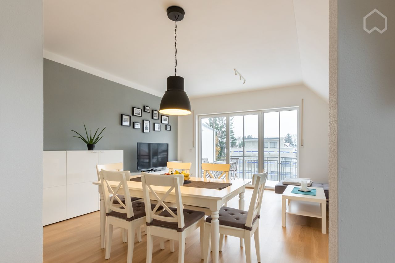 Light-flooded, modern and generous attic apartment, which captivates by its upscale interior design: - Quiet location with a view of the greenery and the Olympic Tower - Fully equipped fitted kitchen with high-quality built-in appliances - Beautiful bathroom with high-quality sanitary equipment and fine stone tiles - Large south-facing balcony with awning - High quality oak parquet flooring in all living rooms and hallways - Closed cellar compartment - Washroom with own washing machine & dryer...