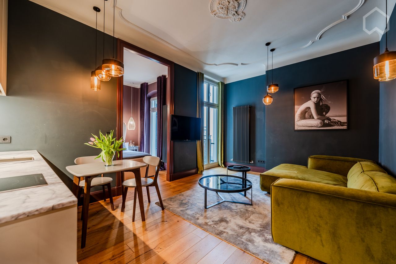 An apartment with high quality selected furniture in the Windscheidpalais. The Windscheidpalais is a house from the Gründerzeit with incredible ceiling heights and stucco facades. A fine address between the famous Ku'Damm and the idyllic Lietzensee - in the middle of the coveted Charlottenburg district. In the neighbourhood, there are original shops and boutiques, creative workshops and delicatessens. In many cafés and restaurants a colourful audience of young and old meets to socialize. In a f...