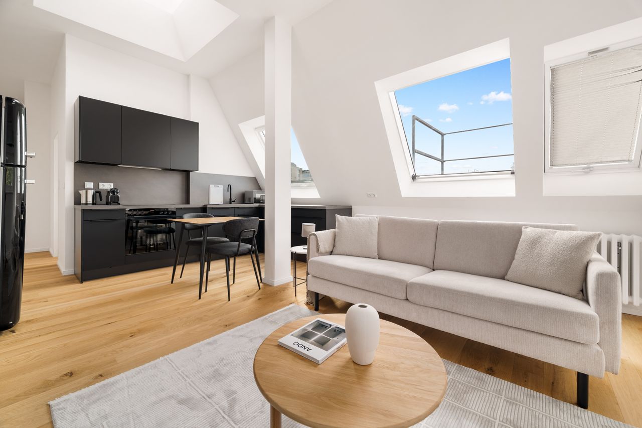This stunning furnished one bedroom apartment features contemporary design, a fully equipped kitchen, and a cozy living area with breathtaking views. Perfectly situated, you'll have easy access to everything that makes Berlin vibrant and exciting!