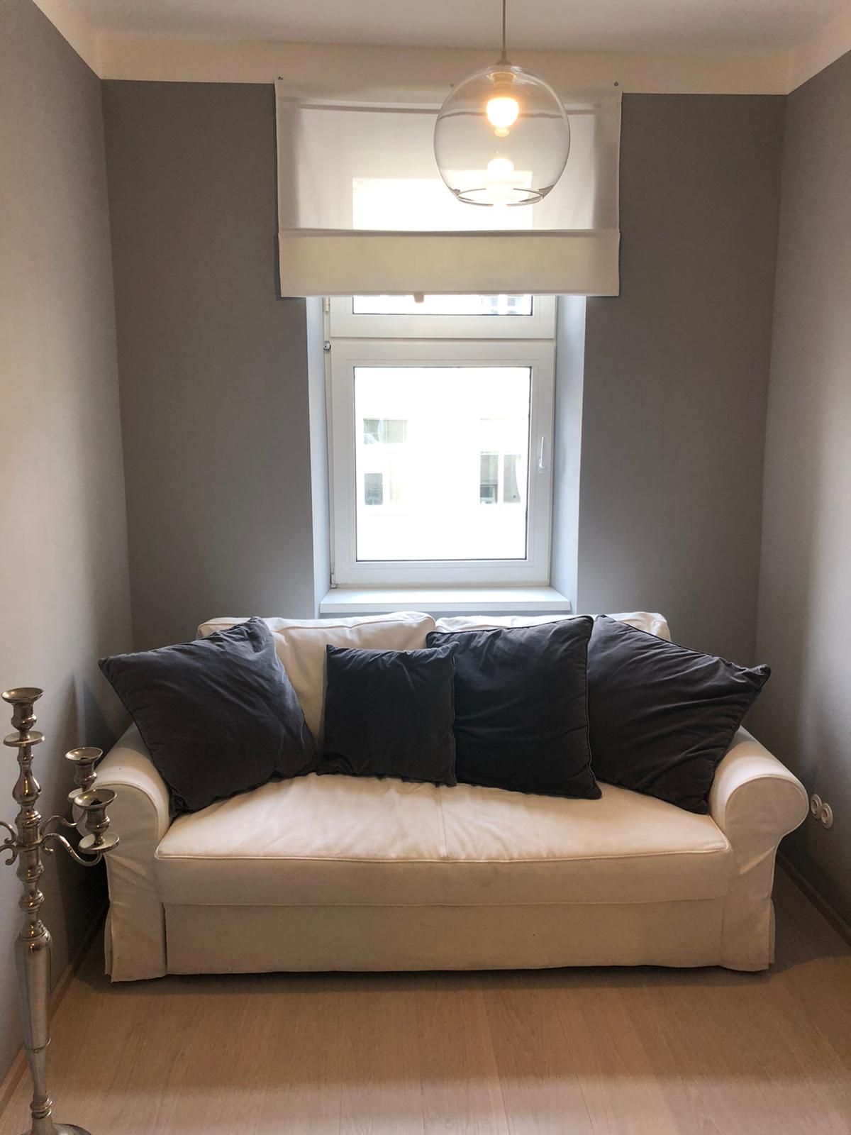 Compact, cosy 1-room apartment with shower, cooking facilities, pull-out sofa, in a quiet location. Fully furnished with pictures, candlesticks, table and armchair, cooking pots, wine glasses, plates, cutlery, clothes rack, coat hooks, tin and bottle opener, bed linen,