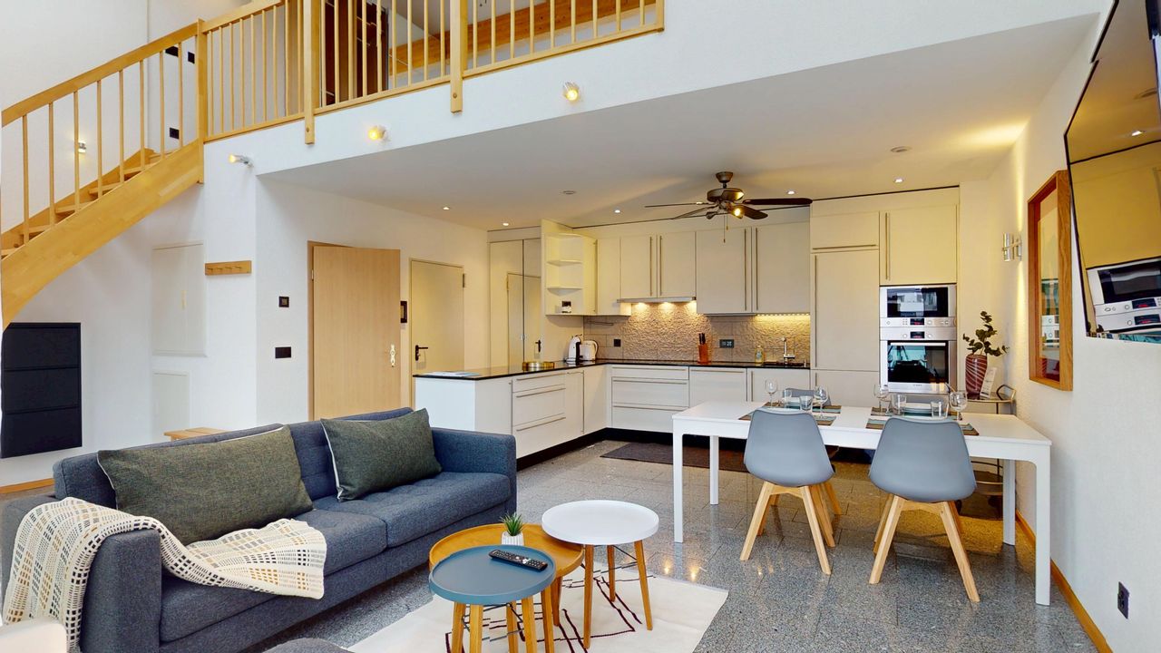Central, urban, bright – newly renovated and furnished – maisonette apartment with plenty of light and space – double whirlpool bathtub on the gallery with a view of the sky – spacious terrace overlooking the rooftops of Basel – open, light-filled kitchen – washing machine and dryer in the bathroom – 5 minutes to the SBB train station and shopping center - in-house gym accessible with Fitpass membership