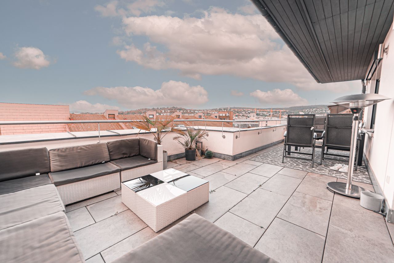Feel completely at home in this luxurious penthouse above the roofs of Stuttgart. It is decorated in glamour style with modern touches. This over 100 m² penthouse includes an XXL roof terrace with sunrise and dreamlike view over Stuttgart. The penthouse has a large dining table with 6 chairs, a KING SIZE HOTELBED, a QUEEN SIZE bed, a mattress as well as SMART TV with surround sound stereo system, free WIFI, kitchenette with NESPRESSO coffee maker and much more.