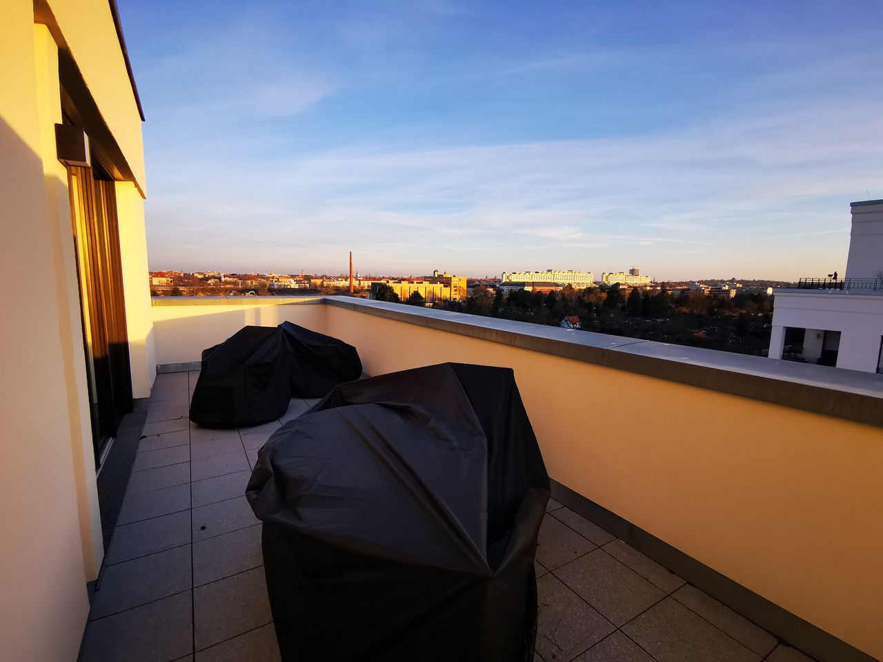 6th floor roof terrace This approx. 110 sqm apartment has 3 bedrooms, 2 bathrooms, living & dining room, roof terrace, lift, Wifi, washing machine, dryer, dishwasher, workplaces, parking space in the basement (separately subject to availability). 3 bedrooms: Equipped with high quality box spring double bed (180 x 200). Separation into 2 separate box spring single beds (90 x 200 each) possible. Also furnished with high-quality sleeping chair, which can be additionally fitted with a mattress and t...