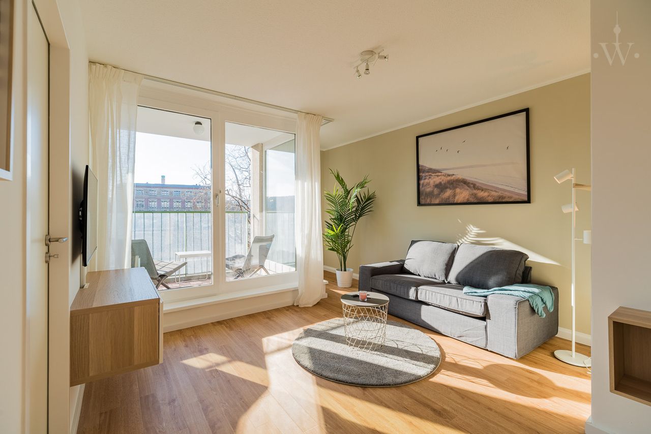NOTE: For terms of <6 months, accommodation tax of 7.5% is due! Far away and yet at home. The comfortably furnished 2-room apartment convinces with its unagitated Scandinavian charm and offers relaxation like in your own four walls. The spacious balcony invites you to relax. The apartment has a large living room with dining area, an open, high-quality kitchen and a modern bathroom with tub. The following highlights await you: - Bedroom with double bed - closet - fully equipped kitchen (el...