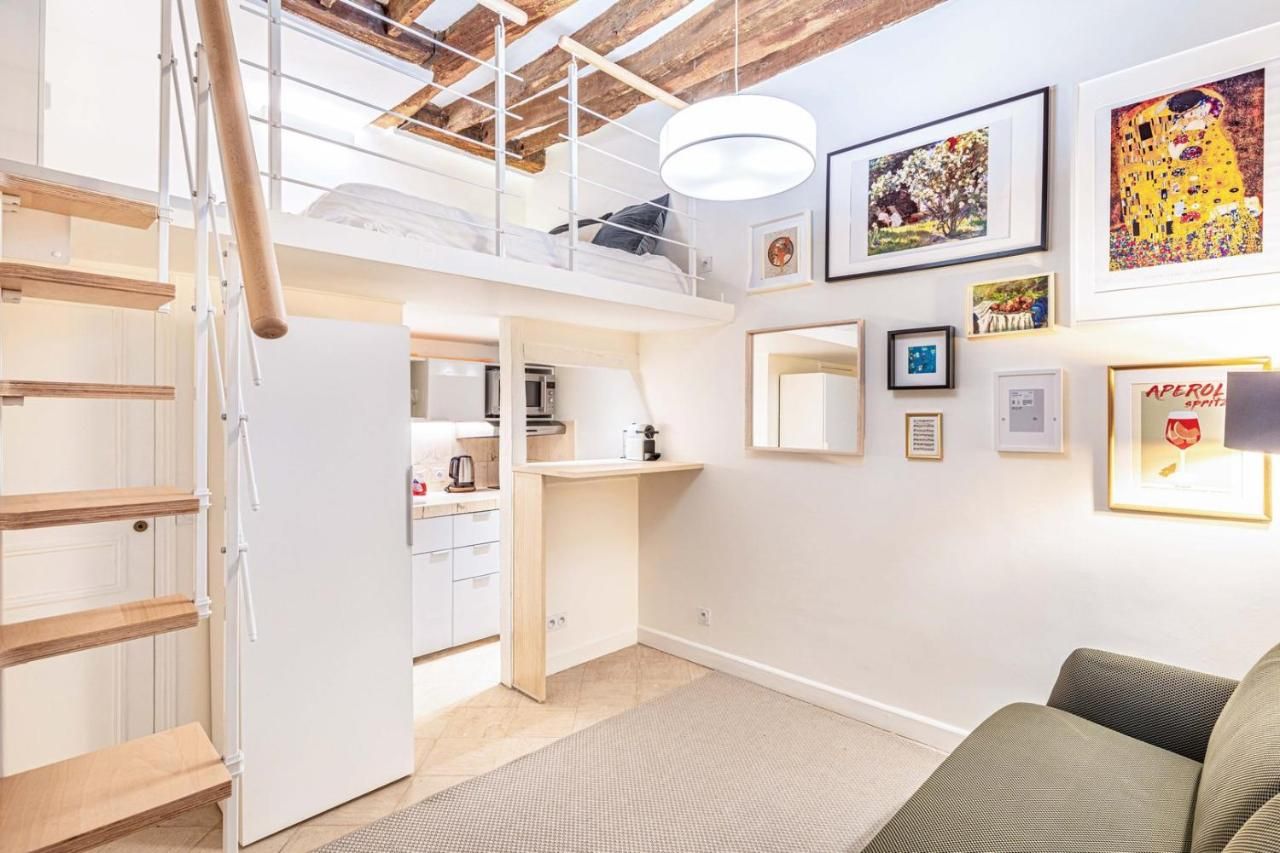 Beautiful studio, practical and welcoming, in the heart of Paris in the 6th arrondissement. Carefully renovated with authentic beams and contemporary furniture, this 20 m² studio overlooks a beautiful, quiet interior courtyard. The living space is friendly with double-height ceilings, consisting of a living room with a mezzanine and a bar area opening onto a modern kitchen. The living room is equipped with storage and a very comfortable designer sofa bed, which can be converted into a double be...