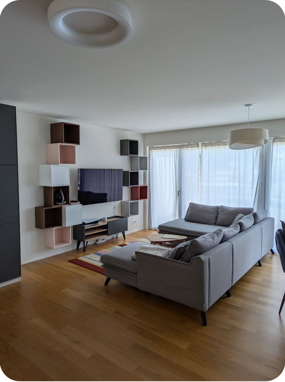 Modern building, 10 min walk away from the Oerlikon train station. Tram stop is 2 min walk from the building and 15 minutes tram ride from Zurich Central station. It is a 3.5 apartment, but one of the rooms will be locked with my personal belongings. The advantages of the apartment are 1 balcony and one large terrace. Personal washing machine and a dryer inside the unit. Spacious living and modern fitted kitchen. Interned is available.