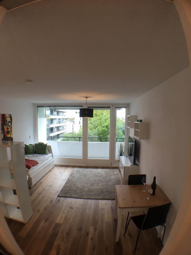 Very bright apartment in a renovated and quiet complex with south facing balcony. Completely equipped with kitchen, dining area, living/sleeping area, hallway and bathroom. The apartment is renovated and has a bright modern bathroom. The large south balcony offers a view up to the Alps. In the corridor there is a large 1.5m wide closet and a checkroom. The bathroom is equipped with a large walk-in shower, flush toilet and modern washstand. In the living room you will find a dining table with 2 ...