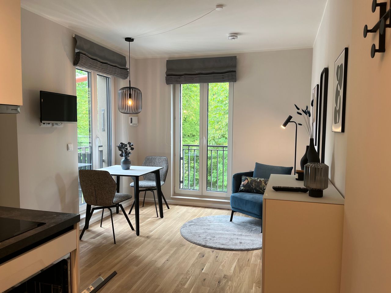 Welcome to your elegant retreat in Potsdam! This beautifully furnished one-bedroom apartment on the second floor of a high-quality new building offers comfort, smart layout, and direct views of the lush greenery surrounding the famous Sanssouci Palace. The open-plan living and dining area is tastefully designed with a cozy lounge chair, a dining table for two, and carefully chosen decorative elements. Floor-to-ceiling windows flood the space with natural light and offer a tranquil view of the h...