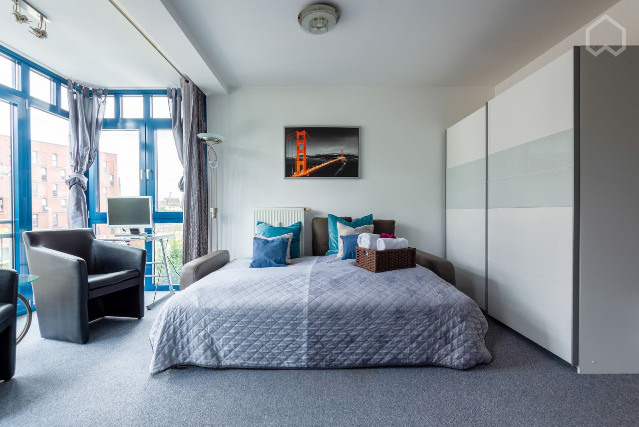 Modern, bright & comfortable 1 room apartment, room-high panoramic windows. Large flatscreen TV, CD player/radio, sofa bed, (+ additional folding bed for 3rd person available) sliding door wardrobe, kitchenette: 2-plate hob, microwave, refrigerator, crockery Quietly situated 2nd floor, lift, own entrance, central city location. Modern building, chic and comfortable equipment, close to the city. Cosy, relaxing ambience, lots of light. An extra bed is available and can be set up for a 3rd person...