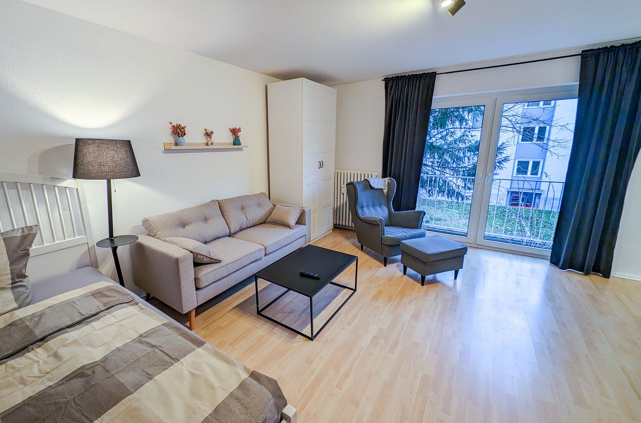 This spacious and modern apartment is right in the heart of Cologne. Despite the central location, the apartment is very quiet because it is located in a small one-way street. Furthermore, the apartment faces the courtyard and thus provides a green and quiet view out of its floor-to-ceiling windows. The apartment is only a few minutes away from Barbarossaplatz by foot. By car, you can reach Cologne / Bonn airport (CGN) within 15 minutes. Cologne central station is only 10 minutes by car. Lovely...
