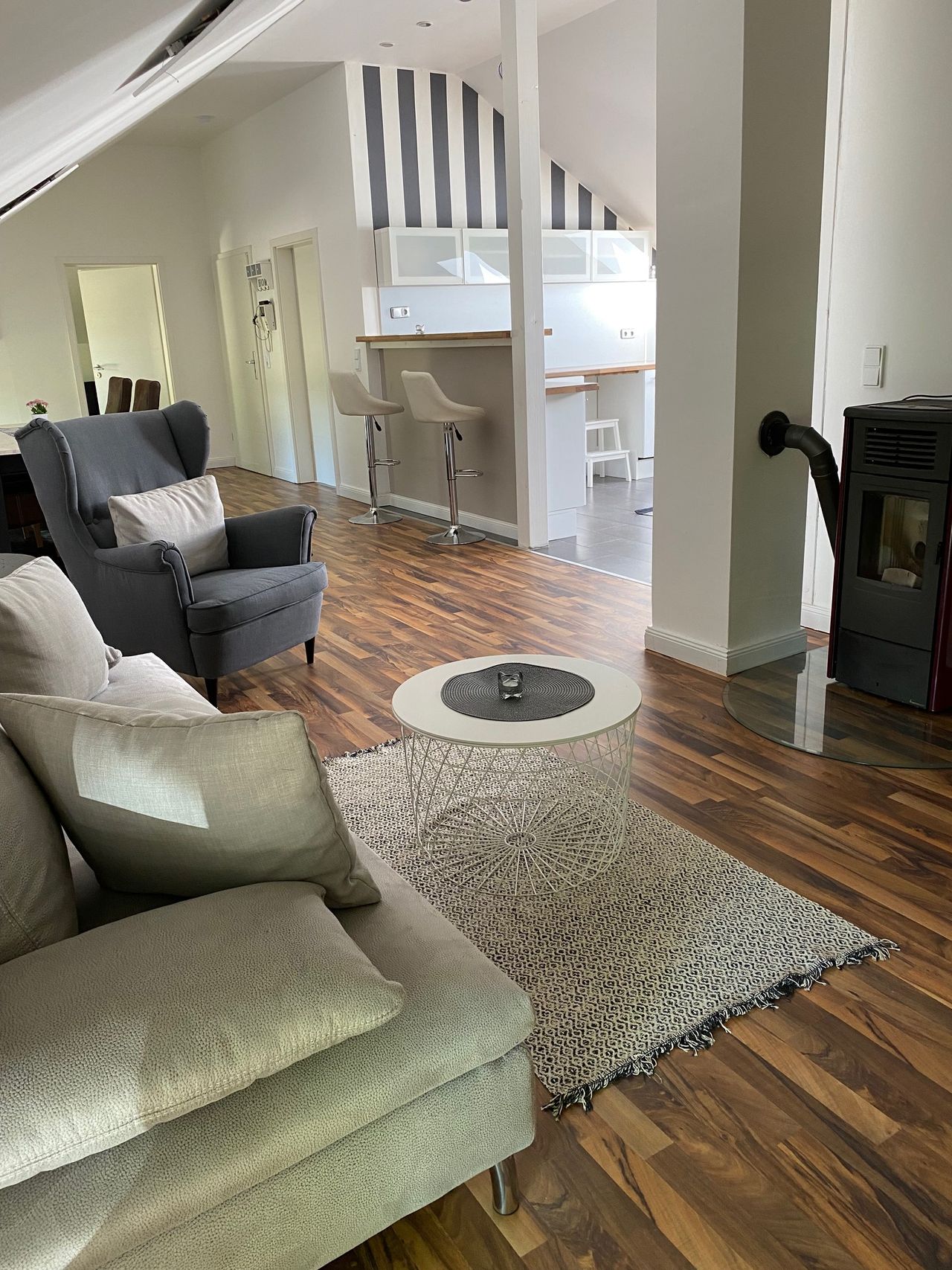 Modern, bright apartment with patio and private parking space. Our facility is right next to the forest and yet with a central connection to Darmstadt / Frankfurt / Aschaffenburg. The apartment has a large open plan kitchen, dining area and living room with a pellet stove. The apartment is equipped with infrared heaters.