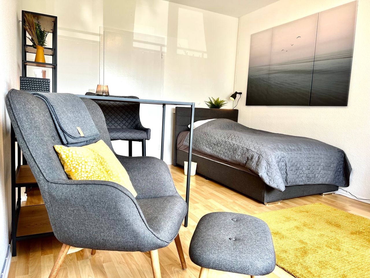 Equipment:Equipment of the apartment: Living area- 34 m2 (max. 1 person). 1 living room and bedroom with a sprung bed, desk (high table) with stool, armchair, smart TV, WLAN free of charge 1 hallway 1 bathroom with bathtub/WC 1 kitchen fully equipped: - Dishwasher - oven - Ceran hob 4er - Refrigerator with freezer compartment - extractor hood - Toaster/ kettle/ coffee maker - Waste separation container Other equipment: - Vacuum cleaner - Mop and broom set - hair dryer - Iron/ironing board ...