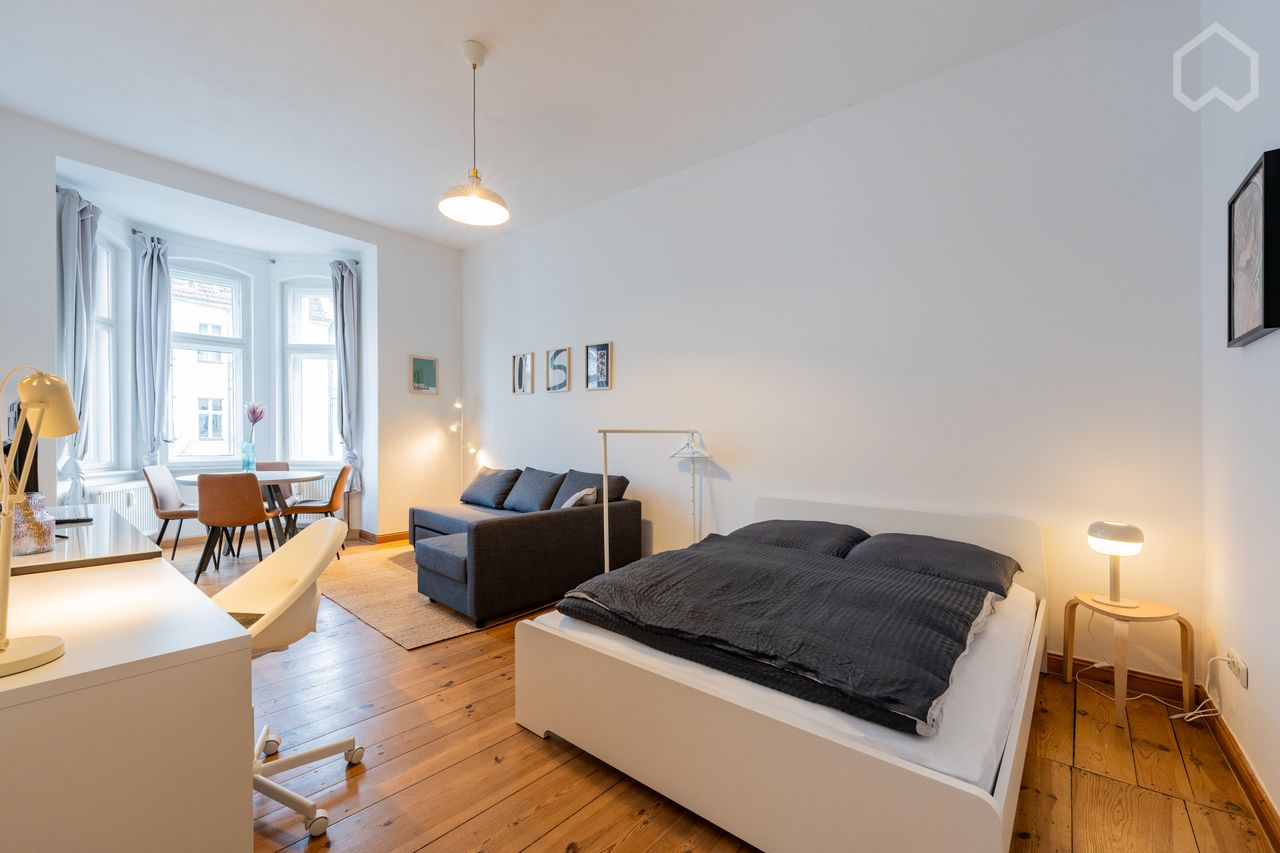 Very nice and furnished 1-room old building apartment in Friedrichshain. The S-Bahn station Ostkreuz is only two minutes away from the apartment. The sunny apartment has a large room with a French balcony. There is a bathroom with a bathtub and a washing machine in the apartment. The kitchen is fully equipped. The price now includes everything / Wifi / bed linen and towels. Minimum stay is 93 nights