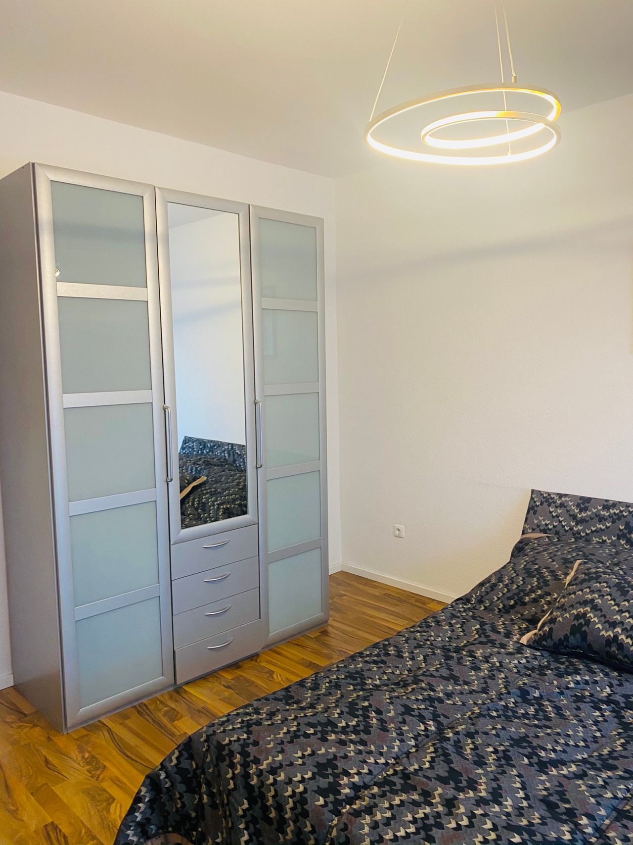 Freshly renovated bright and fully furnished flat located in a small residential and commercial building in the heart of Eschborn, within walking distance to Deutsche Börse, E&Y, Commerzbank, Deutsche Bank, etc. The flat was extensively renovated and modernized in 2019. The flat is located on the 1st floor of a modern house in a quiet street without the typical car traffic. It is furnished with attention to detail and consists of a spacious kitchen, 2 large cozy bedrooms with double beds, a re...