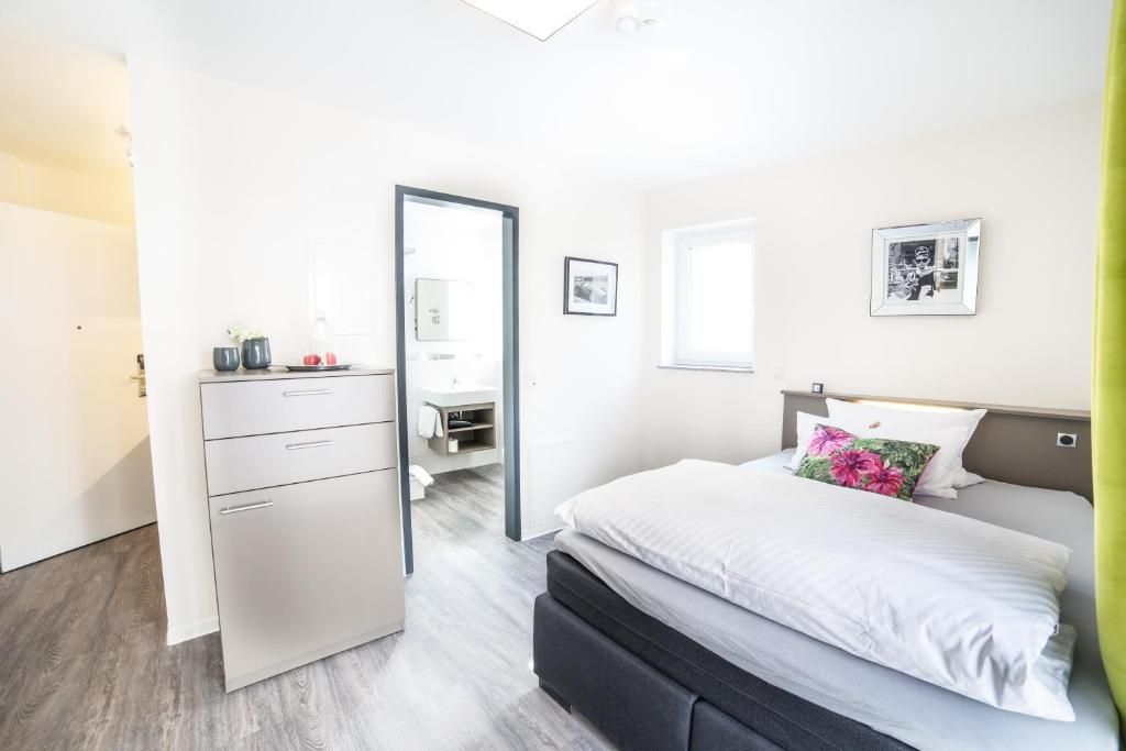 Our apartment house in Friedberg is centrally located and has 16 studios. The 25sqm studios are equipped with a kitchenette with a fridge, a workspace, box spring beds and a bathroom with shower. Guests will also find free city bikes, a large communal kitchen and a laundry room with a washing machine, dryer and iron with ironing board on the lower level. Guests can park on the parking lot behind the building.