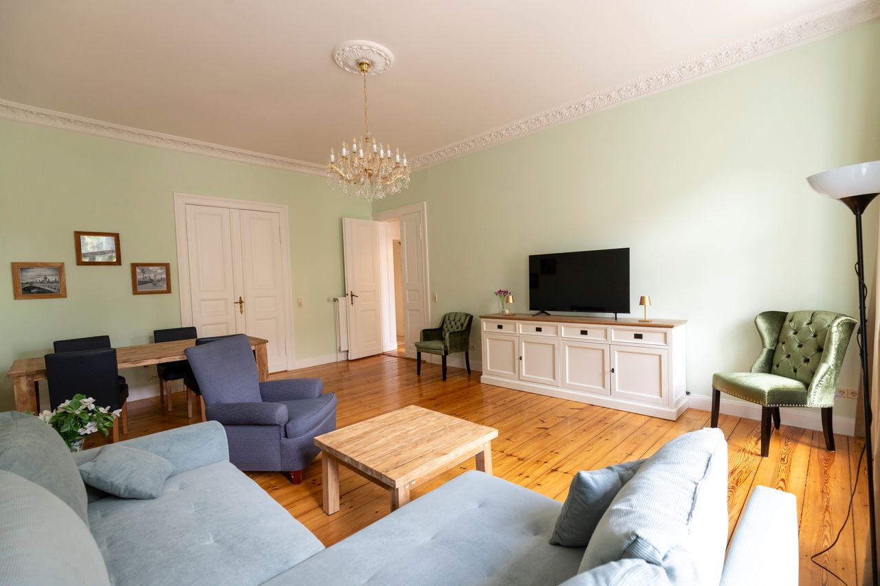The charm of Potsdam lies in the beautifully restored buildings, as well as the beautiful parks and bodies of water. This apartment offers you all this at the most central location. - The apartment is in a beautifully renovated house from 1895 on the ground floor, which can be reached via a separate entrance - almost like a family home. - The apartment was renovated in proper style by professionals and impresses with its stylish color scheme, stucco elements, a perfect layout but also modern e...