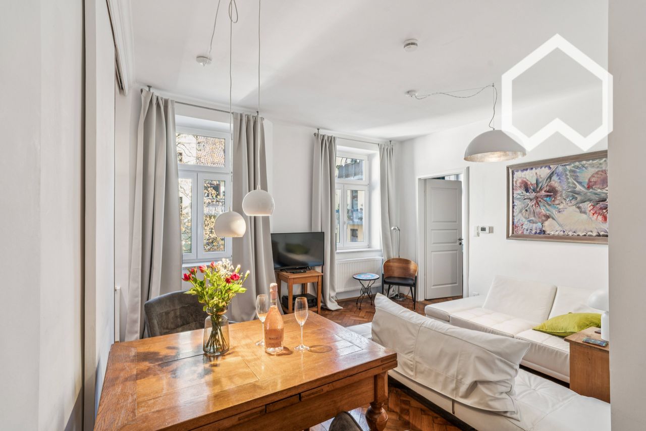 Bright, quiet two-room apartment in a small well-kept residential complex in the popular district of Schwabing-West adjacent to Max-Vorstadt furnished for temporary rent. A new high-quality fitted kitchen, a modernized bathroom with shower and bathtub, a separate toilet, a bedroom with double bed and walk-in closet and a living room with dining area welcome you for a lively time in Munich. Throughout the apartment of the charming old building is still the original real wood parquet in herringbon...
