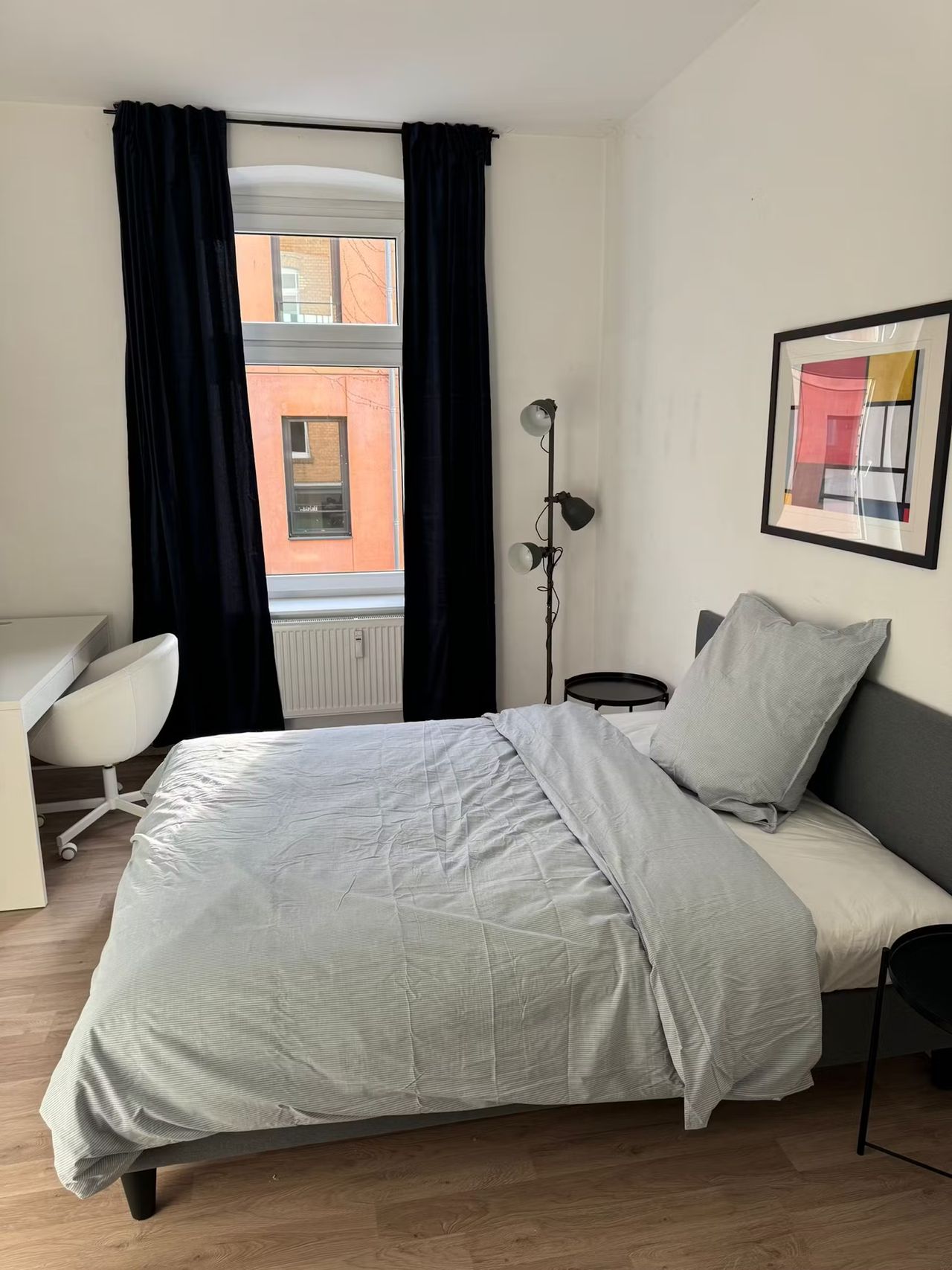 Please keep in mind that the 480€ cleaning fee + 480€ non-deposit fee have to be paid BEFORE moving in. This is an unlimited contract with 1 month notice. This is one of the 4 bedrooms in the apartment. THE ROOM: The room is bright and minimalistic, featuring a comfortable bed with neatly placed gray bedding, a sleek workstation, colorful decor, blackout curtains, and ample storage with a dresser and wardrobe. The modern kitchen includes white cabinetry, a wooden countertop, built-in appliance...