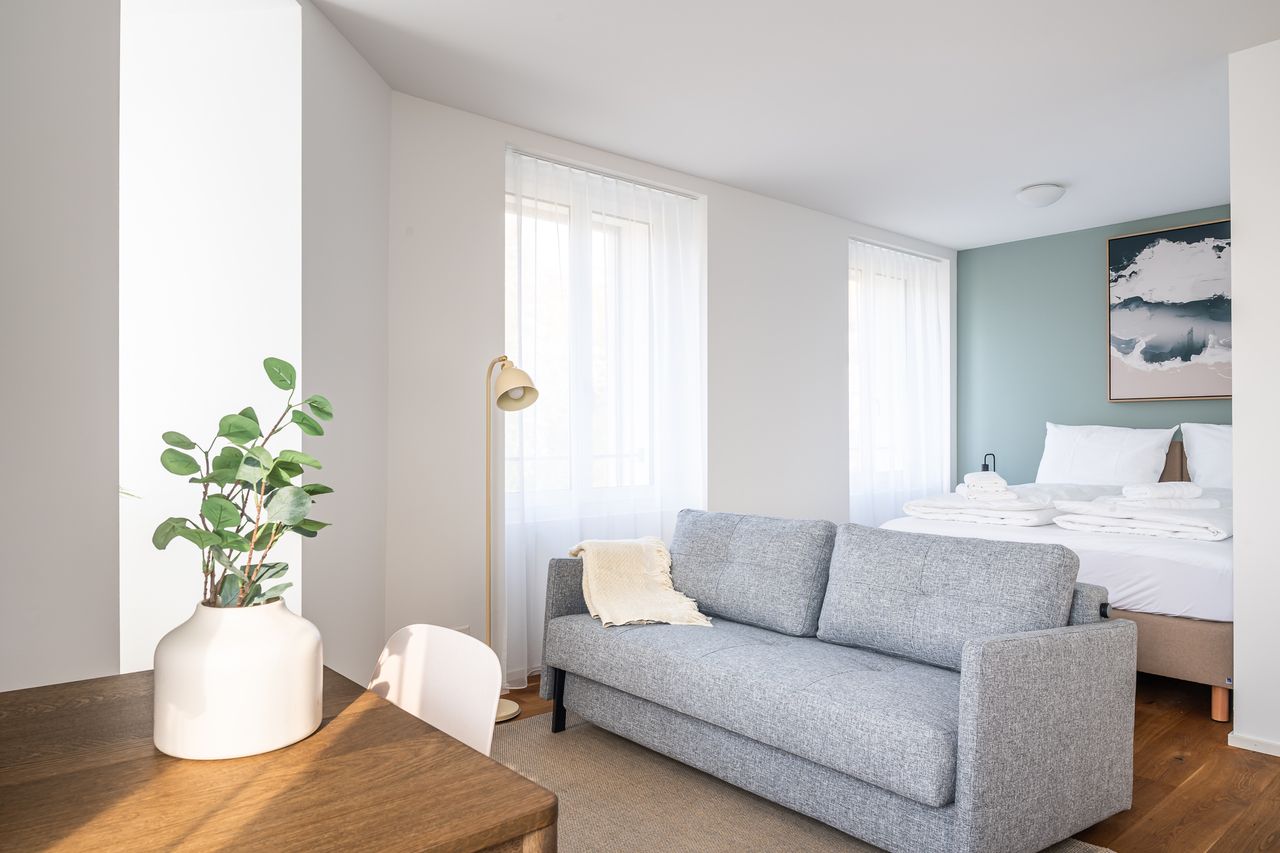 Located directly on the Limmat River, this business apartment in Zurich-Altstetten offers a quiet yet highly convenient living solution. Spanning approximately 30 square meters, this 1.5-room apartment features an open-concept layout and feels pleasantly airy thanks to plenty of natural light. The living and sleeping areas flow seamlessly into one another and feel bright and serene thanks to the large windows. The soft color palette and the carefully chosen accent wall lend the space a subtle w...
