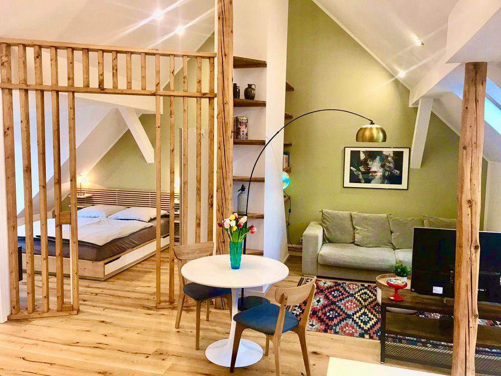 Newly built, fully furnished and equipped, beautifully styled 50m2 premium penthouse loft in a quiet but central location. Beautiful view (4th floor), NO LIFT. High quality furniture, French balcony. Well equipped Kitchen with dish washer, oven, large fridge and freezer. Bedroom separated from living room; 160x200m double bed. Washing machine, dryer
