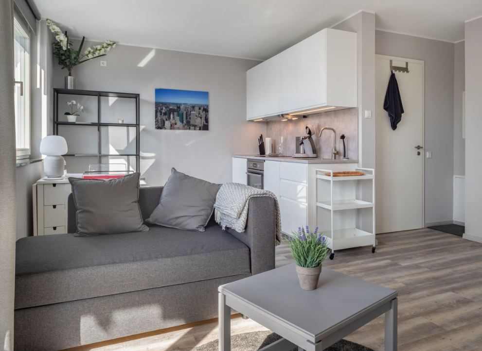 The fully furnished apartment has high quality equipment and a very good cut. The flooring of are equipped with design vinyl. In apartment there is a fully equipped kitchen with white surface, handle-free, in high gloss. The flexible kitchen table can be resized three times and with drawers can also be used as a desk or outside. A terrace is also included. Due to many glass surfaces, the apartment is bright and flooded with light. Curtains and drapes give the possibility of privacy and blackout....