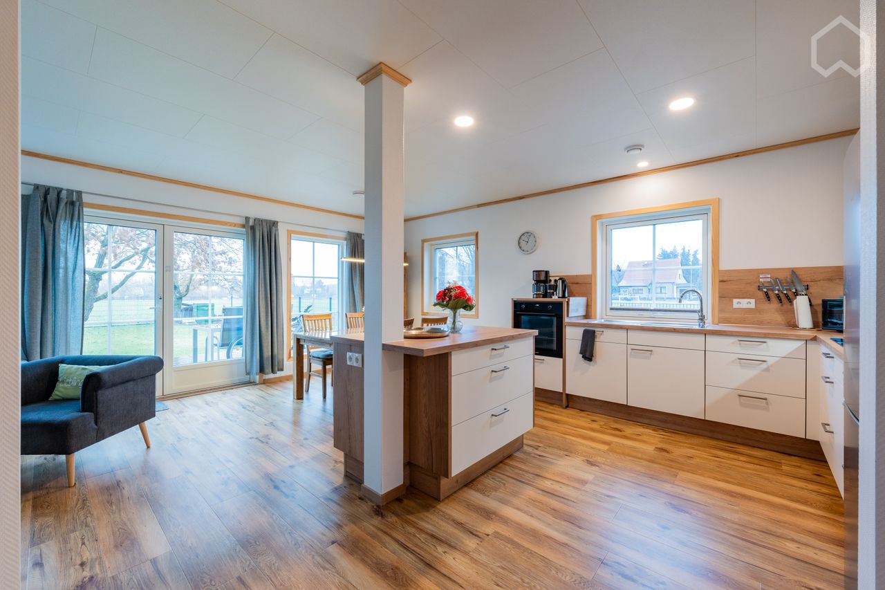 Dear guests, The apartment is located in a residential area in the municipality of Schöneiche, just a few kilometers east of the gates of the capital. The house is very quiet in a field and yet central. You live in a beautiful wooden house. The Norwegian wooden house has 110m² of living space. You sleep in wonderful box spring beds. In five rooms there is a 38sqm living room, a kitchen with dining area and large wooden table, a bathroom with toilet, bidet, washbasin and a walk-in shower. A guest...