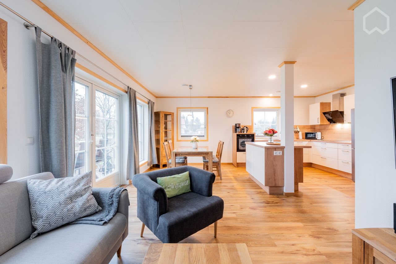 You sleep in magnificent box spring beds. In five rooms there is a 38sqm living room, a kitchen with dining area and large wooden table, a bathroom with toilet, Bidet, washbasin and a walk-in shower. A guest toilet with urinal and extra shower is located on the ground floor Prepare your food in the spacious, American kitchen and use a large refrigerator, dishwasher, a ceranerd, and many other electrical appliances. Enjoy the meal together at the massive wooden table. Relax on the 36 m² wooden te...