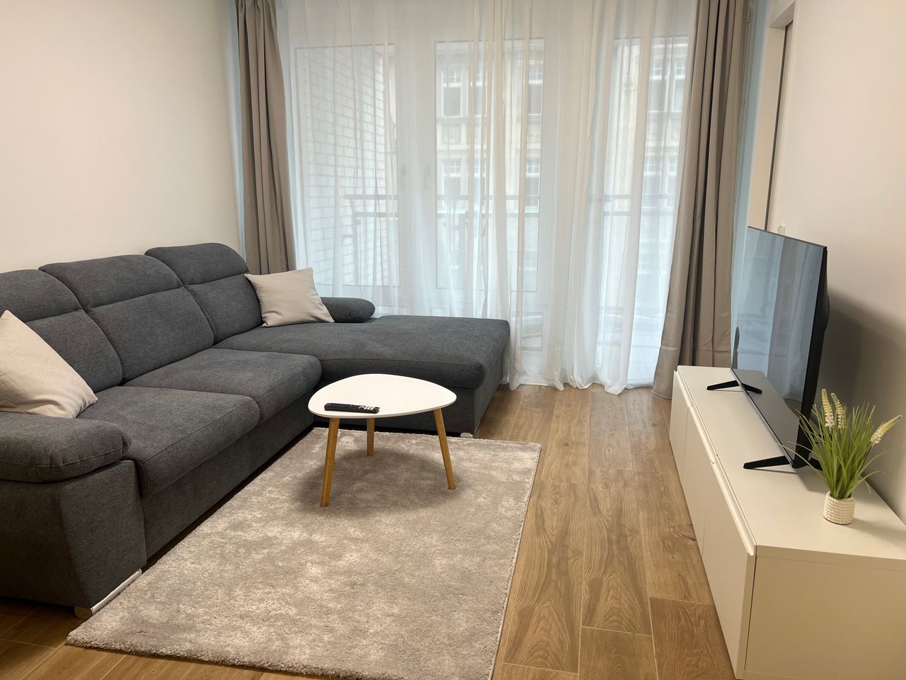Welcome to this bright, newly furnished 1-bedroom apartment in the Checkpoint Plaza building. The apartment features an open-plan living and kitchen area with a fitted kitchen including all necessary appliances and cutlery for your daily needs. The living room is styled with high-quality furniture, including a sofa bed with integrated storage and a 50-inch TV. Large floor-to-ceiling windows lead out to a south-facing balcony offering beautiful views over Berlin-Mitte. The bedroom is equipped wit...