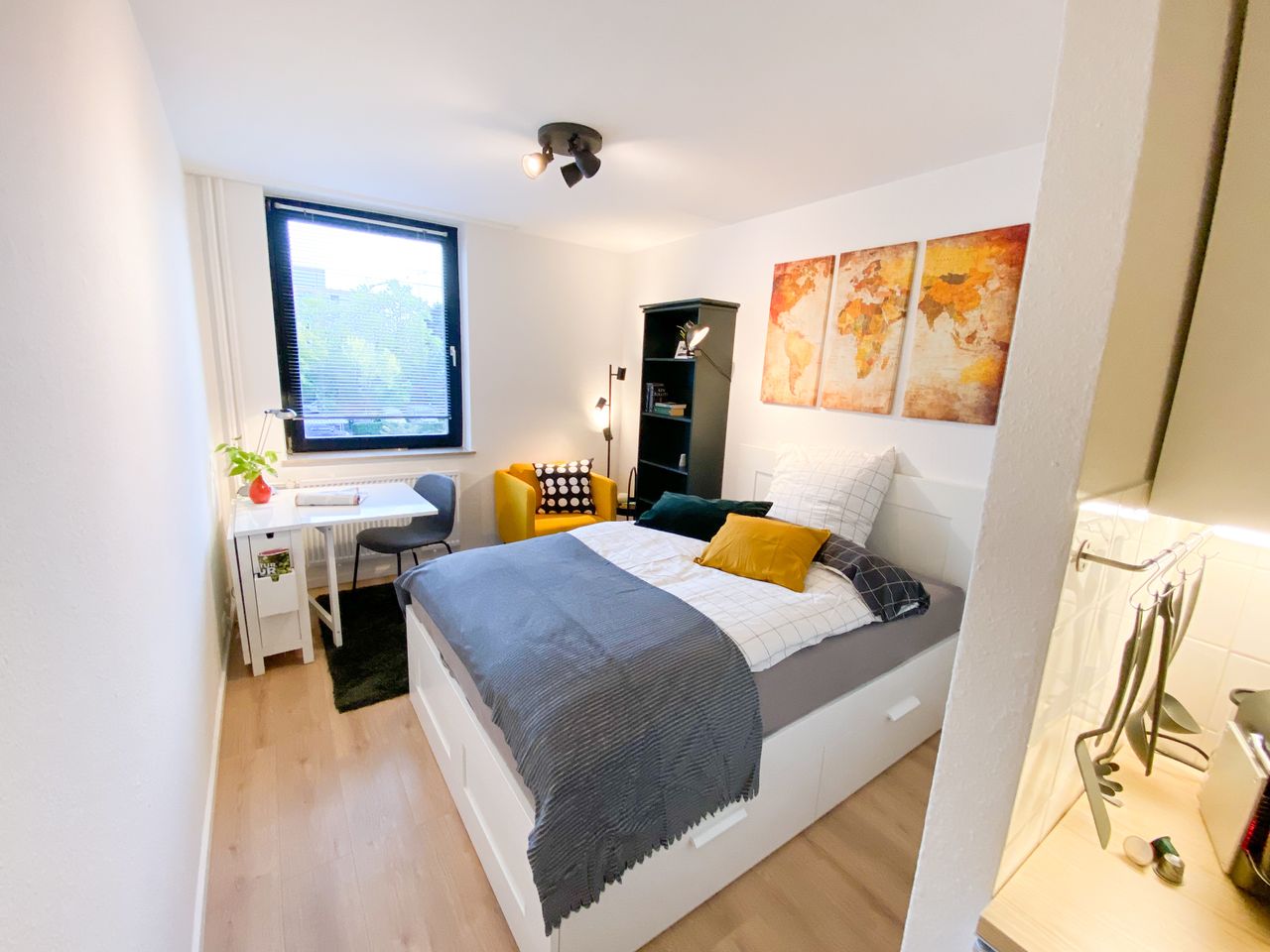 The location of the apartment offers optimal accessibility via public transport and by car. The A60 and A643 are easily accessible. The property is well-maintained and you can reach the apartment comfortably via an elevator. You enter the apartment and find the bathroom to your right. The sanitary objects have been newly installed. Further on the right hand side you will find the new built-in single kitchen with all the accessories you need including kettle, coffee maker and induction hob, wh...