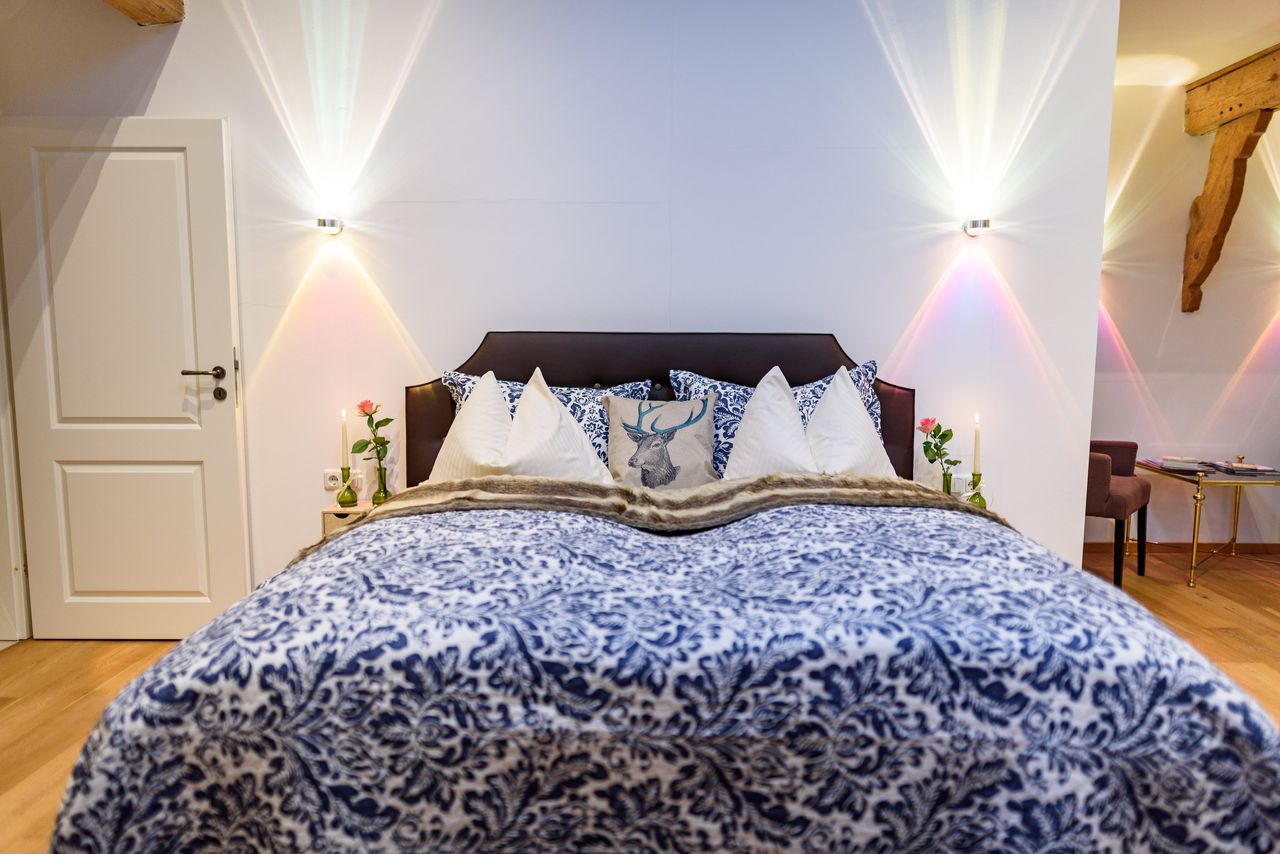 Apartment II at Gut Rechetsberg welcomes you with a cozy living area featuring a flat-screen TV, DVD player, and sound system, as well as a small but fully equipped kitchenette. From here, you enjoy a direct view of the park. In the spacious bedroom, much of the historic building fabric has been preserved and stylishly highlighted with modern lighting features. The very large and high-ceilinged room offers ample space for an additional bed and/or a crib. A modern bathroom with double washbasin, ...
