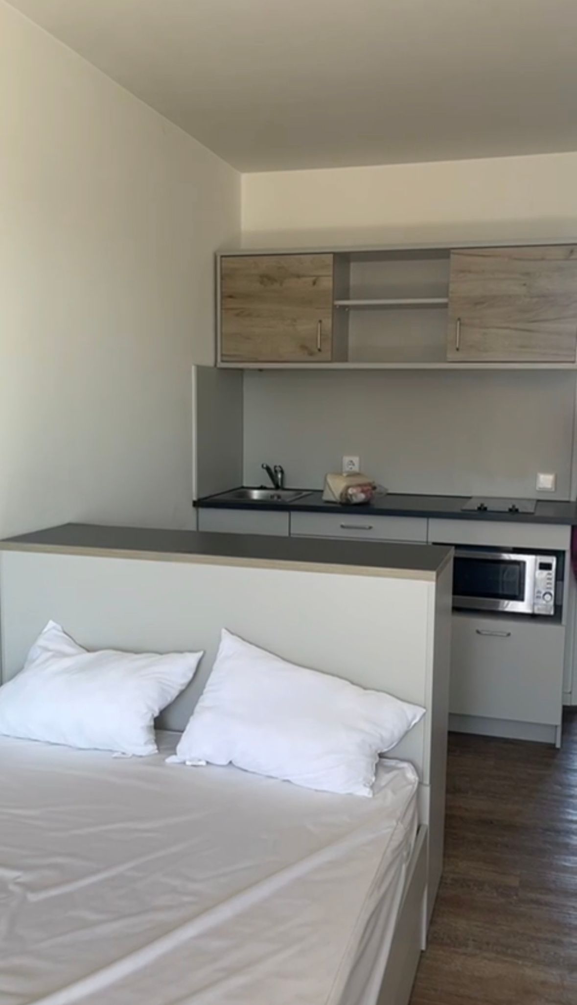 Details: • Verfügbar ab | Available from: 1.10.2025, späterer Einzug ist möglich | later move-in is possible 24 • Größe | Size: S (21-23m?) ₽ • Zimmer Rooms: 1 g • Bett Bed: 120 x 200 Lad • Eigene Einbauküche + eigenes Badezimmer | Private kitchen + bathroom § O • Warmmiete | Total rent: 800€/ Monat | month =N