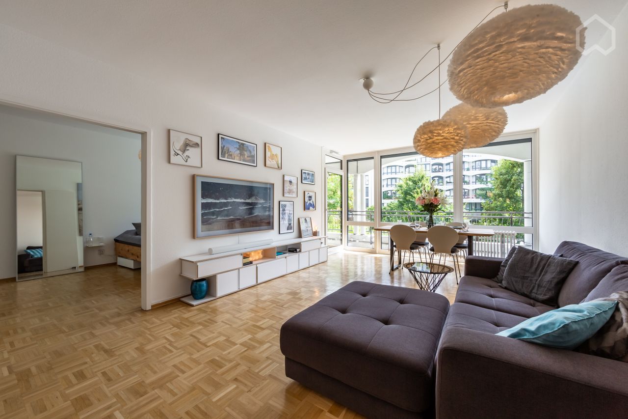 object This bright, friendly and recently modernized apartment offers a beautiful view of the green with a complete glass front with Floor-to-ceiling windows facing the green inner courtyard with an 11qm large south-facing balcony. The spacious living room with a ceiling height of 2.57m offers space for 6 people at the dining table, the daylight bathroom with bathtub was just as freshly equipped with its own washer-dryer as the kitchen with a new dishwasher. The apartment is rented fully furn...
