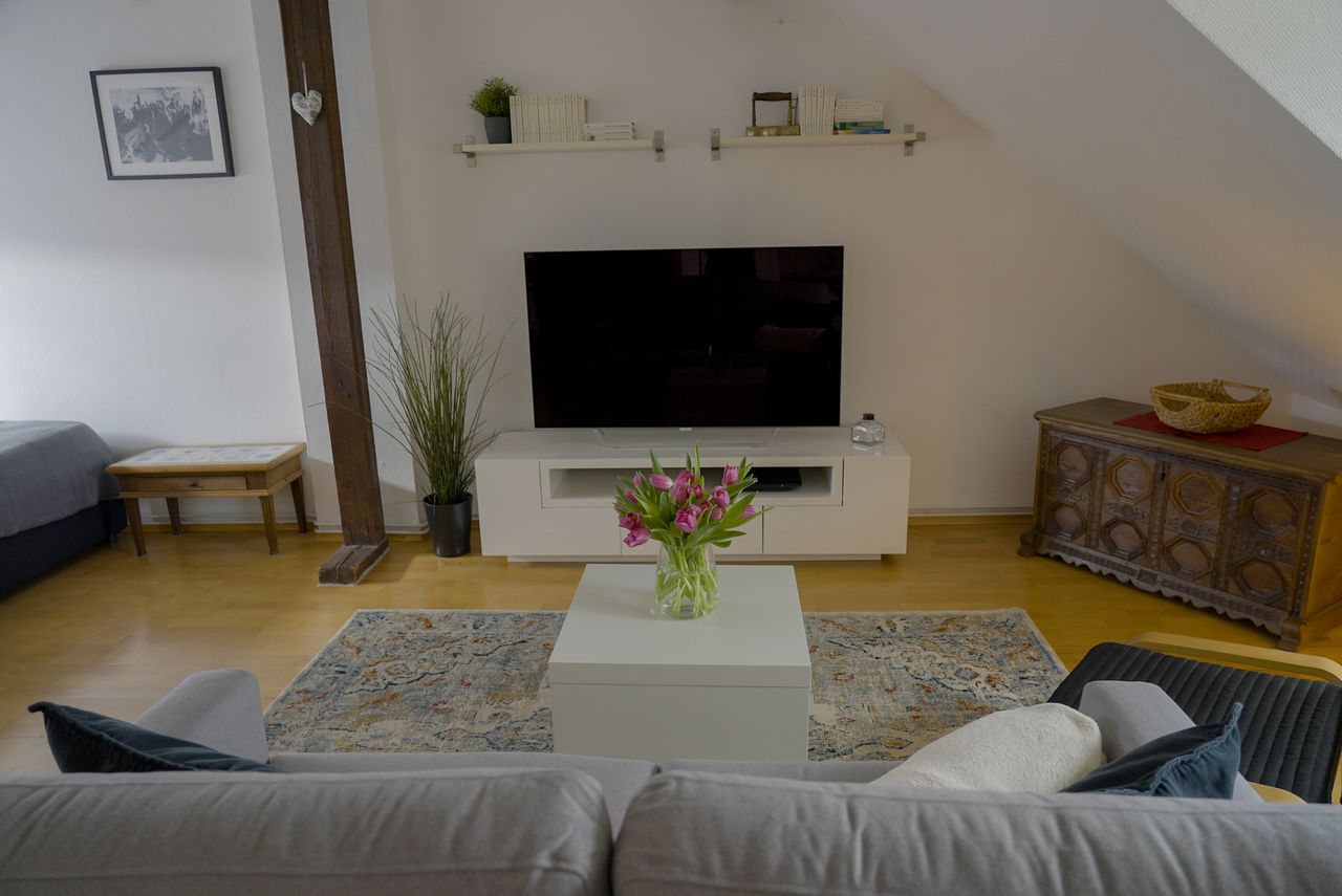 This cozy 50 m² one-room penthouse apartment is located in the Bothfeld district. Thanks to the skylights, plenty of natural light floods the apartment. It features a spacious 180 cm bed. The fully equipped fitted kitchen makes the flat practical for everyday use. Ample parking is available directly in front of the building. Bothfeld is a green residential area with good public transport connections to Hanover city center.
