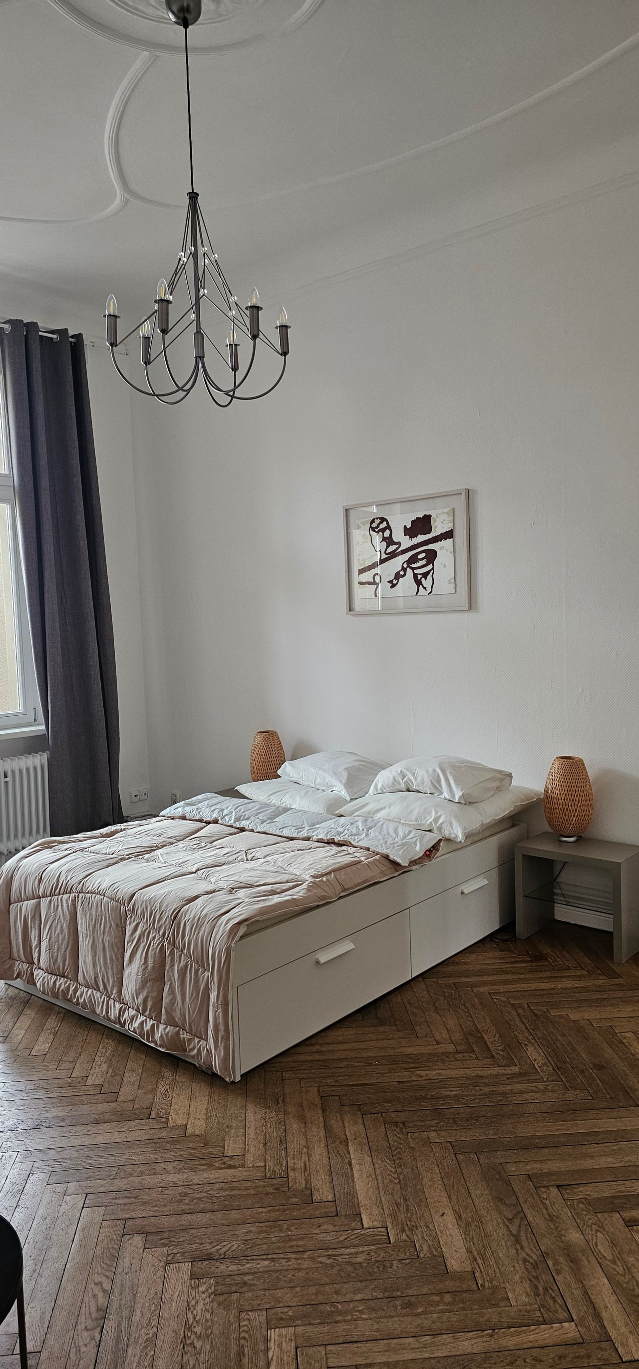 This wonderful 4-bedroom shared apartment is located in the heart of Berlin, part of a beautiful Altbau building- with very high ceilings. The area is well known for trendy boutiques, restaurants & bars, awesome club scene, shops, hotels in the immediate vicinity, as well as the Famous Lietzenseepark- which offers a wonderful lake view and a stunning park. Amazing public transportation/train stations in walking distance to the building. This 26m2 bright bedroom is equipped with a super comforta...