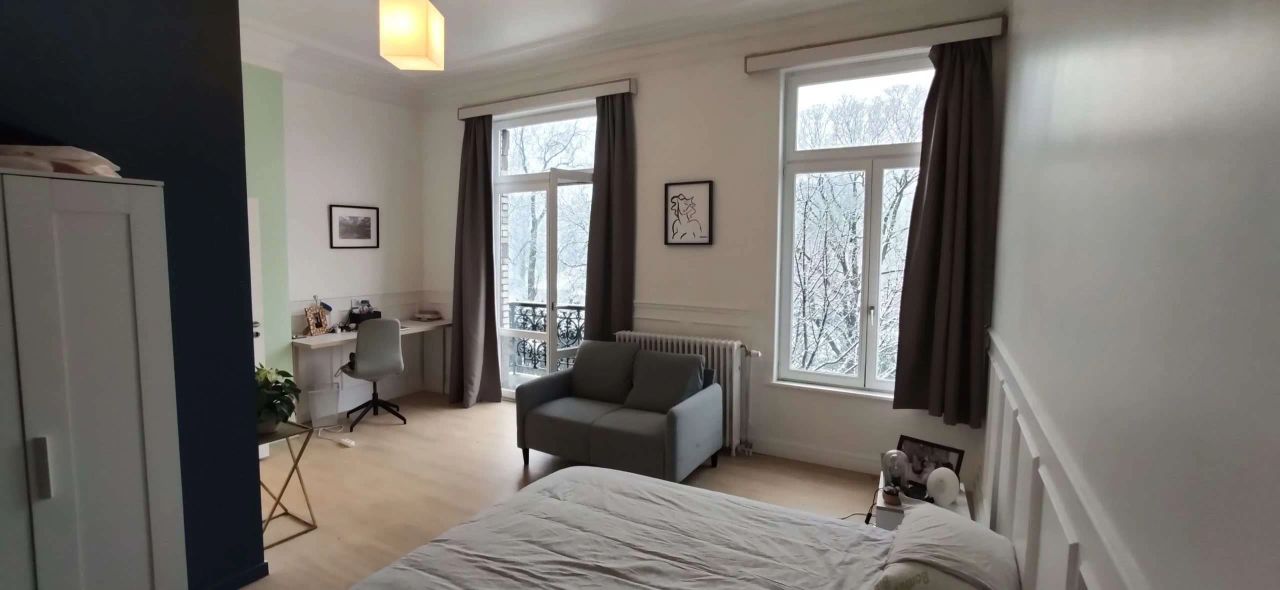 Room 7 of the Maison Cinquantenaire is located on the second floor, facing the street. The room is equipped with a bed, a bedside table, a desk, a chair, a wardrobe, and blackout curtains. The bathroom and toilet are directly accessible from the room. The room measures 21m² and has a small balcony.