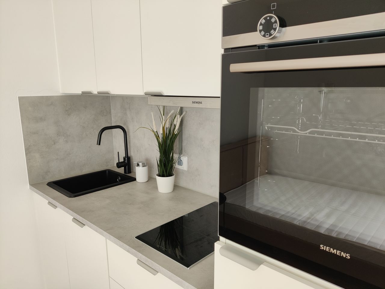 Modern, newly renovated 1-room apartment (approx. 26 m²) – ideal for tradespeople (cleaning not included). Living/sleeping area with dining nook, bed, desk, and wardrobe. Creates a balcony feel by opening both French doors. New fitted kitchen with modern induction cooktop, refrigerator, and dishwasher. Newly partially renovated bathroom with shower, modern sink, and new fixtures. Fully furnished with high-quality design, flooring, lighting, etc. Quiet location on a side street, yet very w...