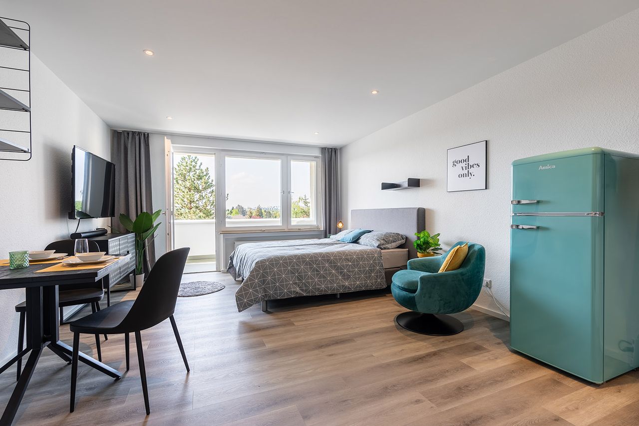 Modern furnished apartment with loggia in Hürth-Hermülheim Bedsitter with kitchenette, hallway, bath with tub and toilet, loggia Modern and high-quality furnishing with bed 140 cm - large screen cable TV, internet connection included - fitted kitchen with dishwasher ready to move in only with a suitcase in the cellar for sharing: coin-operated washing machines, dryers, ironing machines and on arrangement also cellar bar