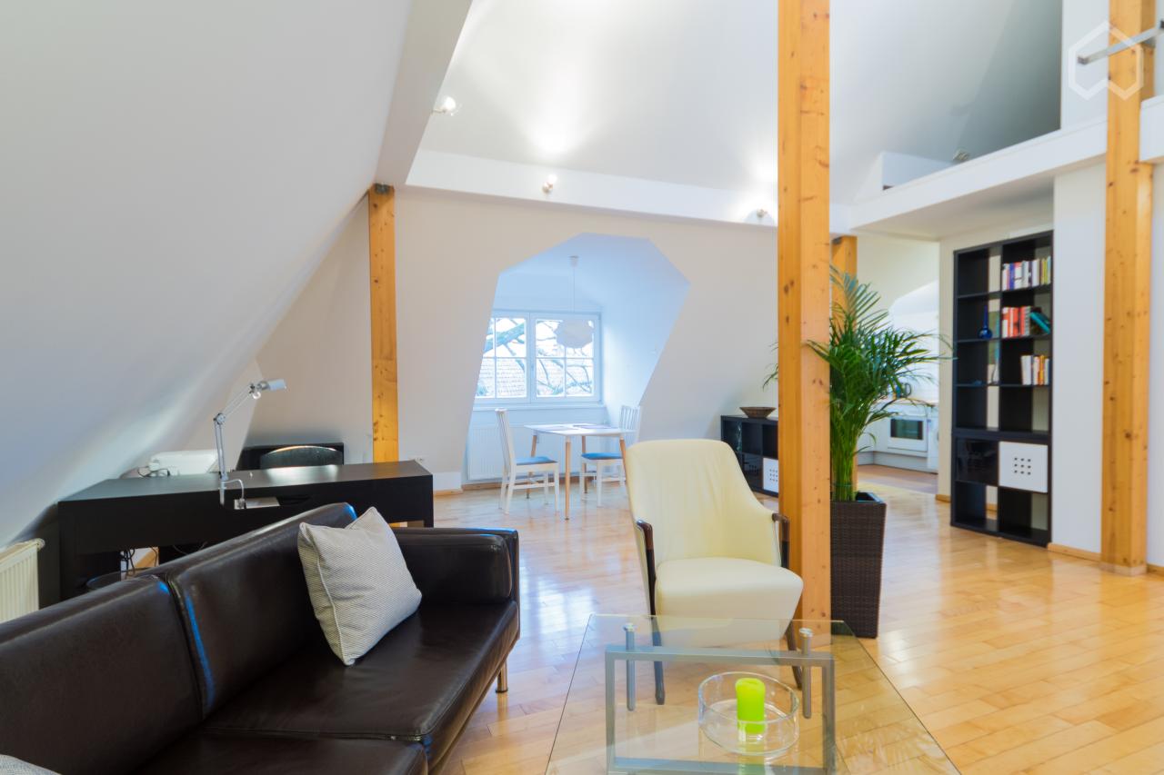 This 64 square meter apartment strikes especially through its high ceilings, which are up to 5 meters high as well as through its open floor plan that lets extra sun light in the apartment. The fully equipped kitchen features ceramic hobs, a stove, a microwave, a fridge, a coffee machine as well as a washing machine. In the large room, there is a corner that is furnished with a couch, TV, DVD player and a HiFi system. In another corner you will find a desk and next to it a small dining area. In ...
