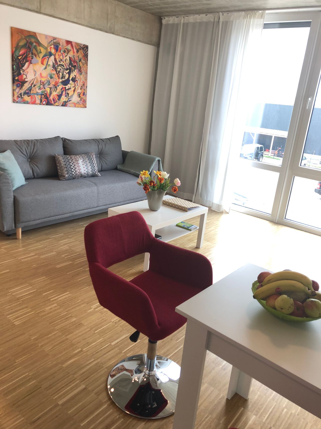 Fully furnished - move in with your suitcase and feel at home! Rental period max. 2 months, with option of extension after consultation with landlord Bright 2-room apartment new construction (orientation southwest) high quality furnished with parquet flooring 1st floor The high walls, give the rooms a special generosity. - Kitchenette with built-in stove and oven, dishwasher and refrigerator/freezer combination (toaster, kettle, Nespresso coffee maker, etc.), New: SodaStream Sprudler - Croc...