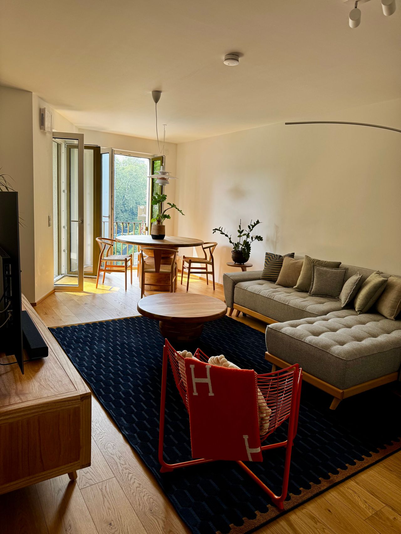 The apartment is located in the vibrant, central Neuehrenfeld district of Cologne, just 300 meters from tram line 5, with fast access to downtown, city parks and major highways. On-street parking is also available. Surroundings include: - Supermarket (Rewe - walk distance) & bakeries (next corner) - Restaurants & cafés - Parks, gyms (24h gym at walk reach) & medical offices - Cultural venues, bookstores & schools Despite its centrality and proximity to train line, the apartment and the street it...