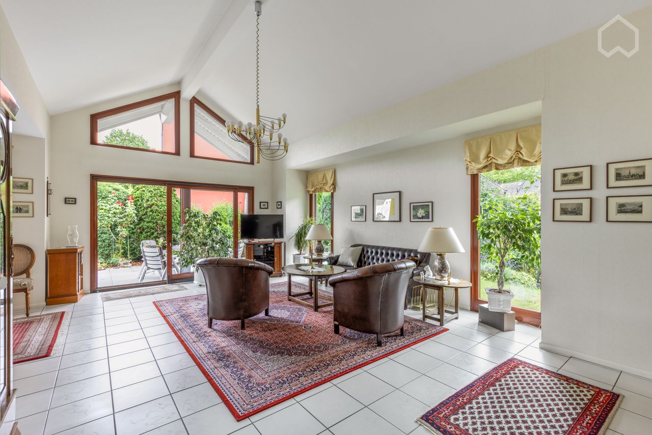90.57 sqm of living space on one level with a large, representative living and dining room (see photos), bedroom with double bed and walk-in closet, shower room, guest toilet and fully equipped kitchen. The house has a full basement. In the 77.85 sqm basement there is a large office and a guest room with a double bed. There is also a utility room and a storage room in the basement. The house is in the second row from the street. The gate and the garage can be opened with a remote control. A b...